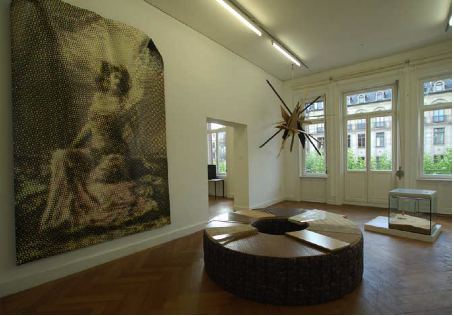 stand up. walk around. lay down. look around. talk. watch, 2010, 2m x 2m, verschiedene gebrauchte Holzplatten, Stoff, lackierte Polsternägel